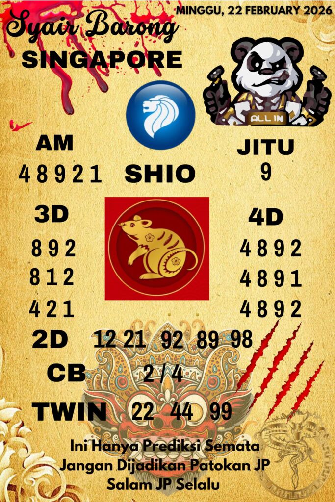 Prediksi DENSUSTOTO menyediakan Syair Togel Singapore resmi yang dapat anda saksikan dalam situs judi togel online ini. Setiap pemain judi togel online yang tidak memandang dan mengenal syair togel singapore pastilah kurang mujur buat mendapati angka keluaran togel terjitu. Lantaran itu sekarang situs judi togel online DENSUS TOTO sekarang akan memberikan anda bocoran bagaimana caranya mendapati nomor keluaran prediksi singapore dari syair togel sgp terjitu. Sekarang anda cuma perlu dan mengenal code syair singapore ini merupakan prediksi singapore yang dituang terdapat sifat code syair. Maka serius tidak bertanya-tanya jikalau sejumlah penggemar togel begitu menyintai prediksi syair togel ini. Buat prediksi syair singapore dapat dipakai buat bahan ketidaksamaan mencari angka jitu yang bisa keluar pada hari ini. Karenanya berhati-hatilah selalu pada setiap terdapat dipicu di situ dapat anda angka bermain 2D, 3D dan 4