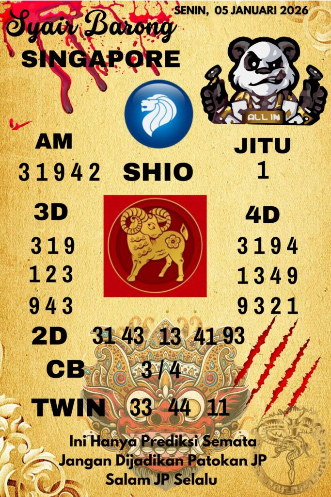 Prediksi DENSUSTOTO menyediakan Syair Togel Singapore resmi yang dapat anda saksikan dalam situs judi togel online ini. Setiap pemain judi togel online yang tidak memandang dan mengenal syair togel singapore pastilah kurang mujur buat mendapati angka keluaran togel terjitu. Lantaran itu sekarang situs judi togel online DENSUS TOTO sekarang akan memberikan anda bocoran bagaimana caranya mendapati nomor keluaran prediksi singapore dari syair togel sgp terjitu. Sekarang anda cuma perlu dan mengenal code syair singapore ini merupakan prediksi singapore yang dituang terdapat sifat code syair. Maka serius tidak bertanya-tanya jikalau sejumlah penggemar togel begitu menyintai prediksi syair togel ini. Buat prediksi syair singapore dapat dipakai buat bahan ketidaksamaan mencari angka jitu yang bisa keluar pada hari ini. Karenanya berhati-hatilah selalu pada setiap terdapat dipicu di situ dapat anda angka bermain 2D, 3D dan 4D